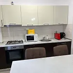 Geniet van een ingerichte kitchenette in Rbc Apartments With Garden View And Parking met een koelkast, een oven en glaswerk voor uw gemak. Complexul Tempus Nord bushalte is in de buurt van de 1-badkamer accommodatie. The apartment provides guests with een terras.